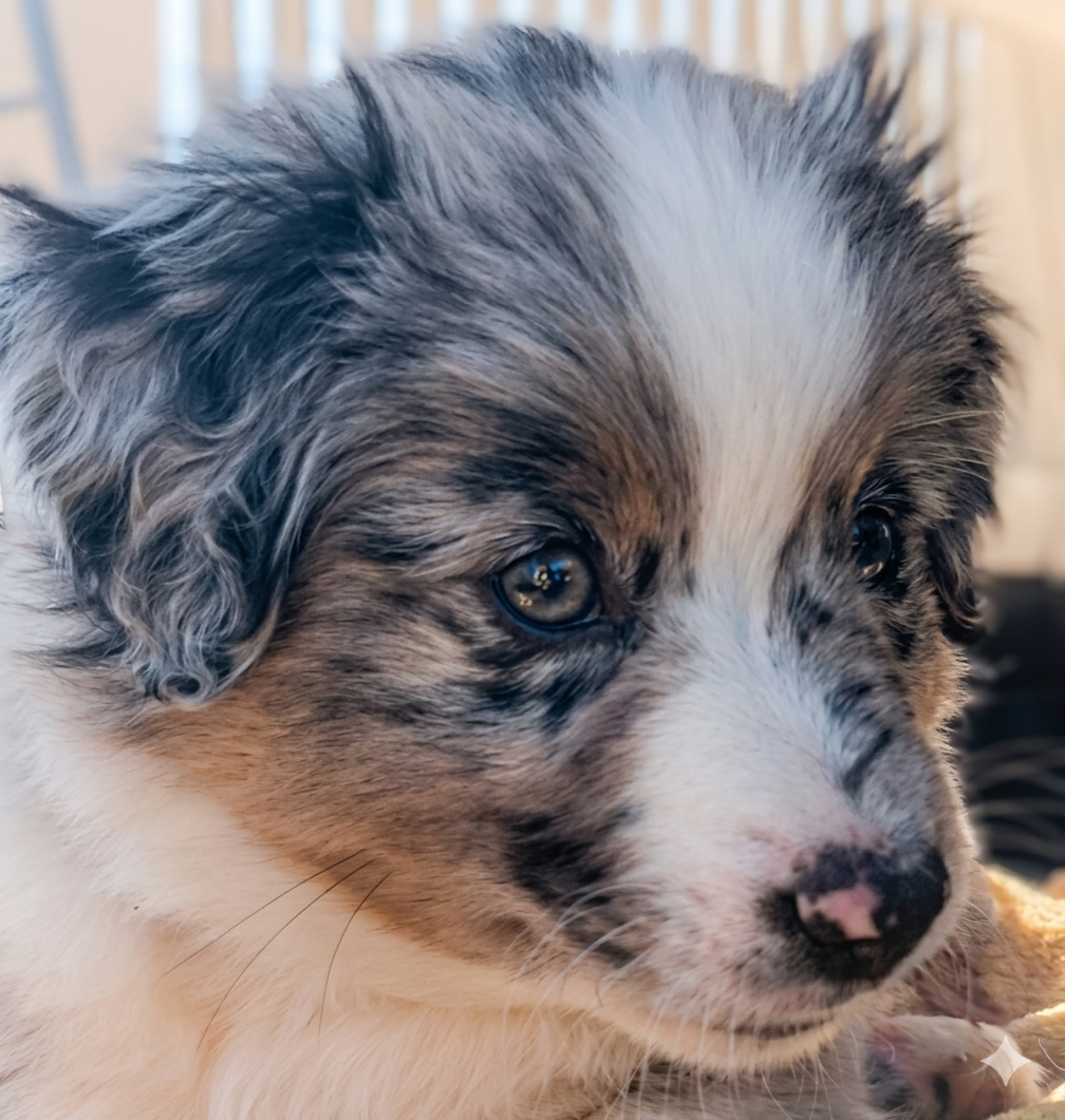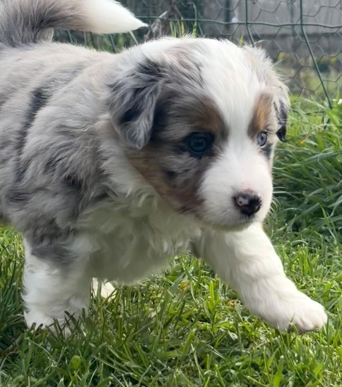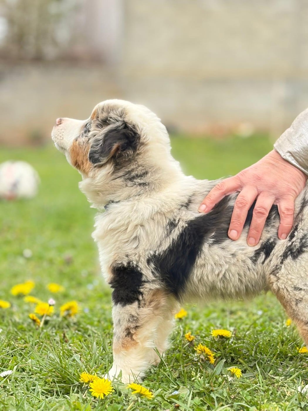 Il a l'âge de rejoindre sa famille! Sociabilisation impeccable. Acquisition des bases d'éducation et désensibilisation pour la marche en laisse. Mâle Bleu Merle Tricolore 1ère naissance et pionnier de l'affixe. Queue Longue. Yeux ambres. Full clear par parenté. D'une tendresse et sensibilité incroyable. Un super caractère proche de l'homme. Il est l'équilibre et la neutralité de la portée. Portée tant attendue réunissant le meilleur des lignées "sang bleu" 100% Franco-Américaines. Une ascendance rare regroupant les plus grands affixes US : Moonbaby s, Pockets, Away To Me, 74 Ranch et Alta.