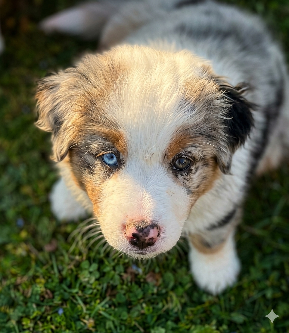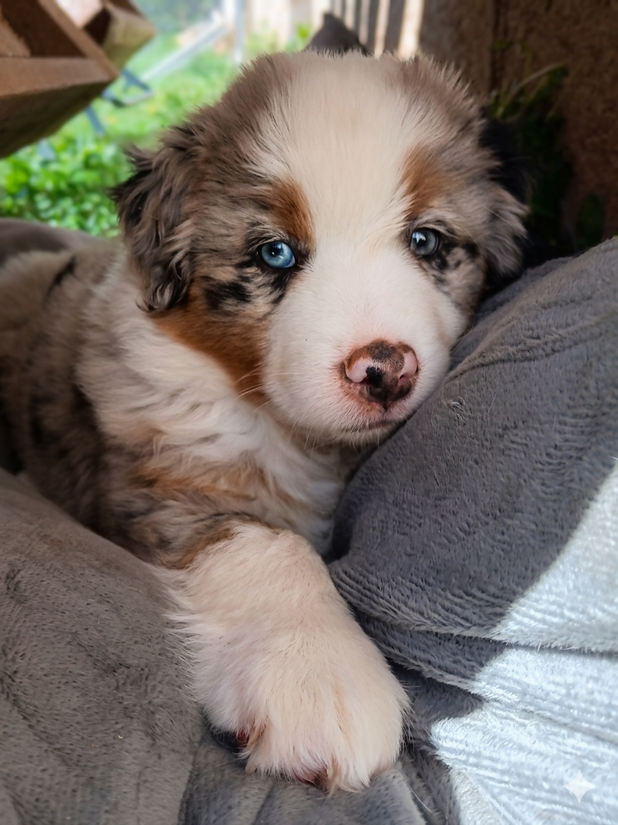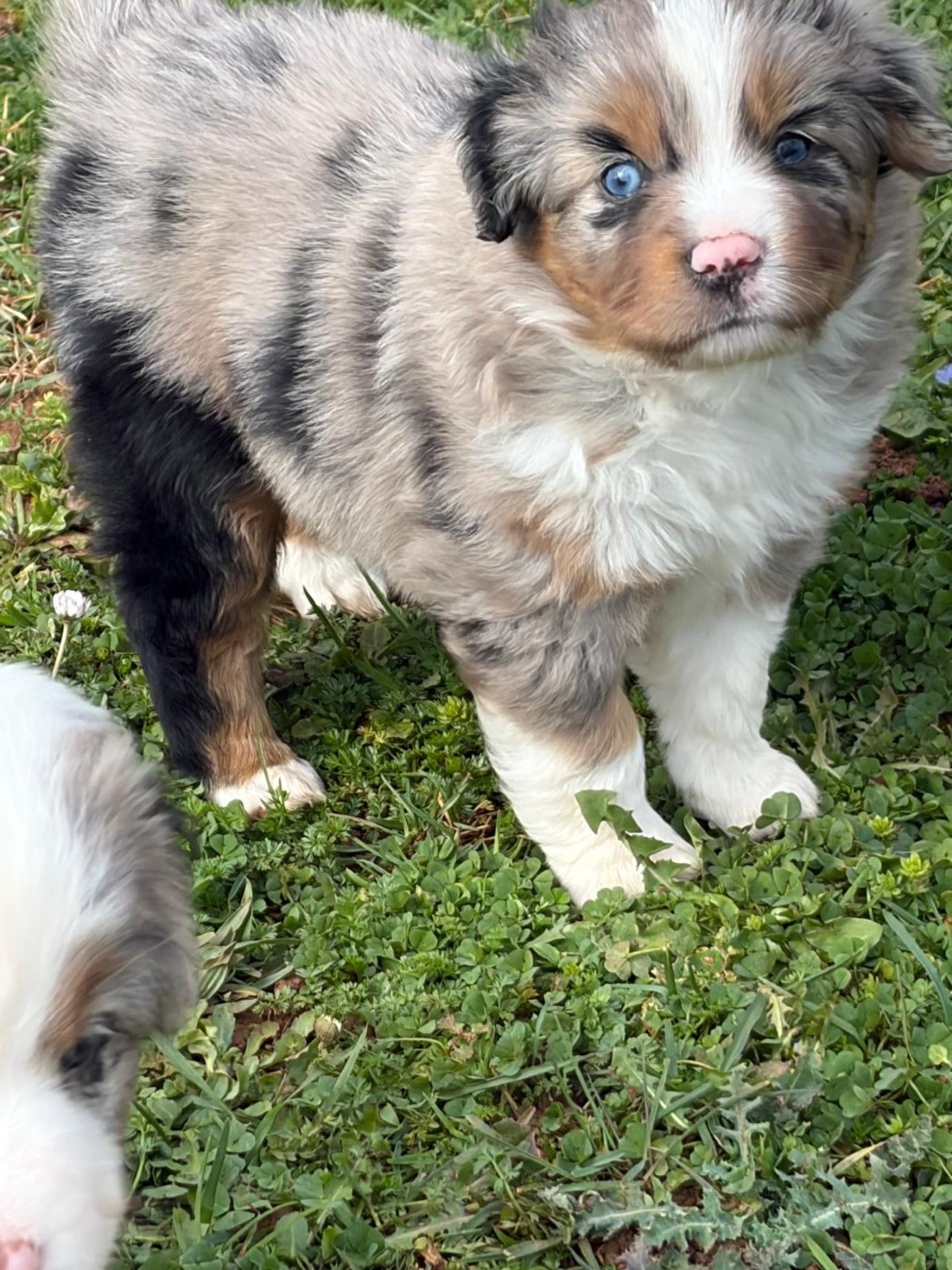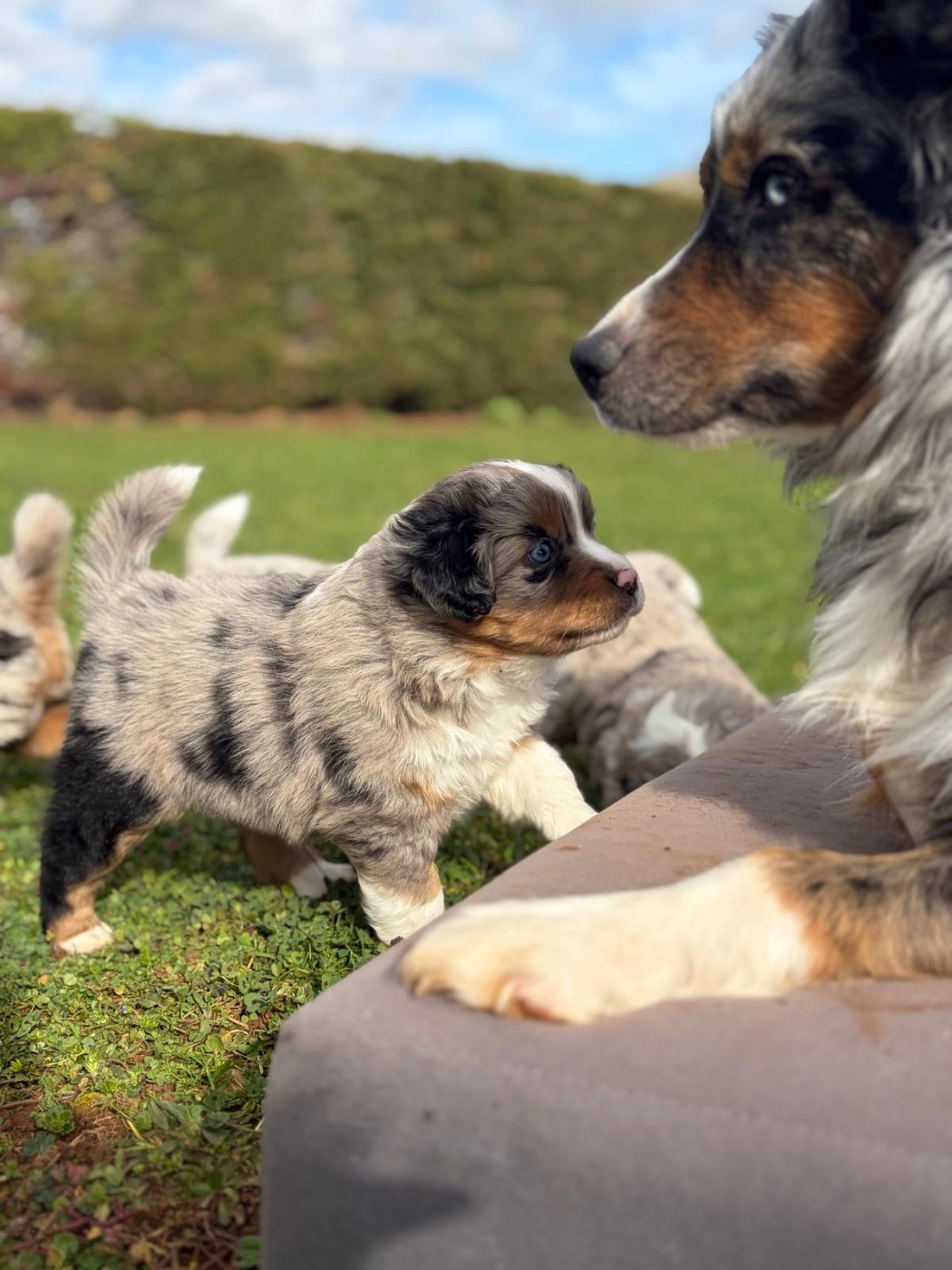 Il a l'âge de rejoindre sa famille! Sociabilisation impeccable. Acquisition des bases d'éducation et désensibilisation pour la marche en laisse. Mâle Bleu Merle Tricolore 1ère naissance et pionnier de l'affixe. Queue Longue. Yeux ambres. Full clear par parenté. D'une tendresse et sensibilité incroyable. Un super caractère proche de l'homme. Il est l'équilibre et la neutralité de la portée. Portée tant attendue réunissant le meilleur des lignées "sang bleu" 100% Franco-Américaines. Une ascendance rare regroupant les plus grands affixes US : Moonbaby s, Pockets, Away To Me, 74 Ranch et Alta.