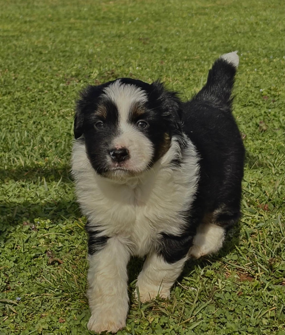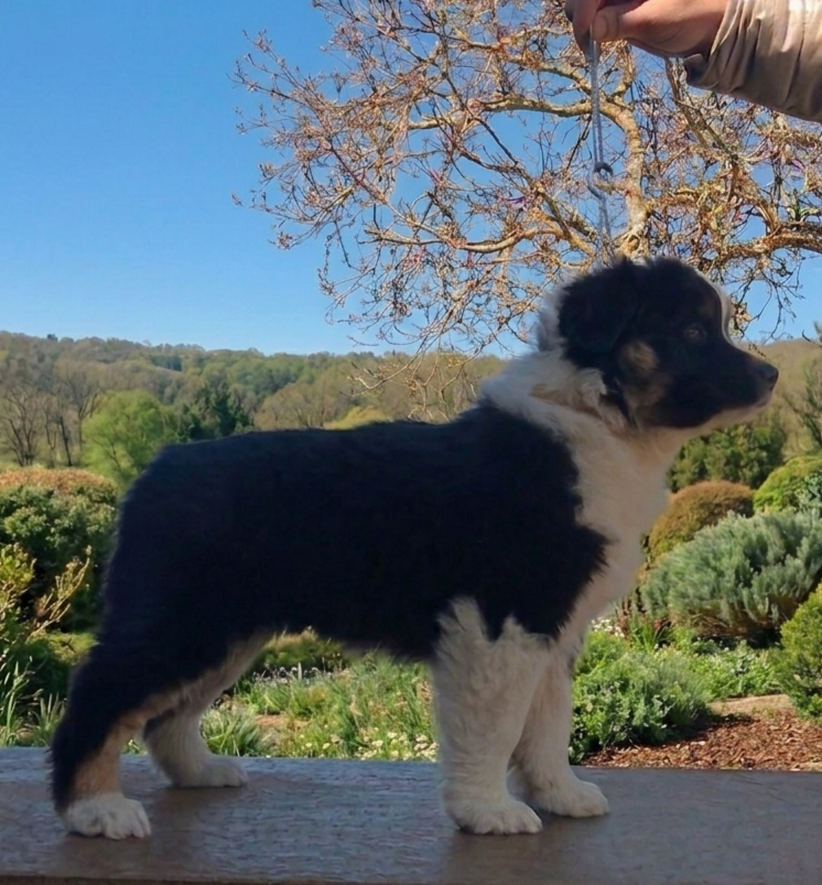 C'est le seul tricolore noir de la portée arrivé en 3ème position. Il se distingue forcément au milieu d'une portée de bleu merle silver pour la plupars. Le noir ébène est profond. Full clear par parenté. Queue longue. La maman et moi même l'affectionnons tout particulièrement et je garde un oeil dessus pour l'élevage. Portée tant attendue réunissant le meilleur des lignées "sang bleu" 100% Franco-Américaines. Une ascendance rare regroupant les plus grands affixes US : Moonbaby s, Pockets, Away To Me, 74 Ranch et Alta.