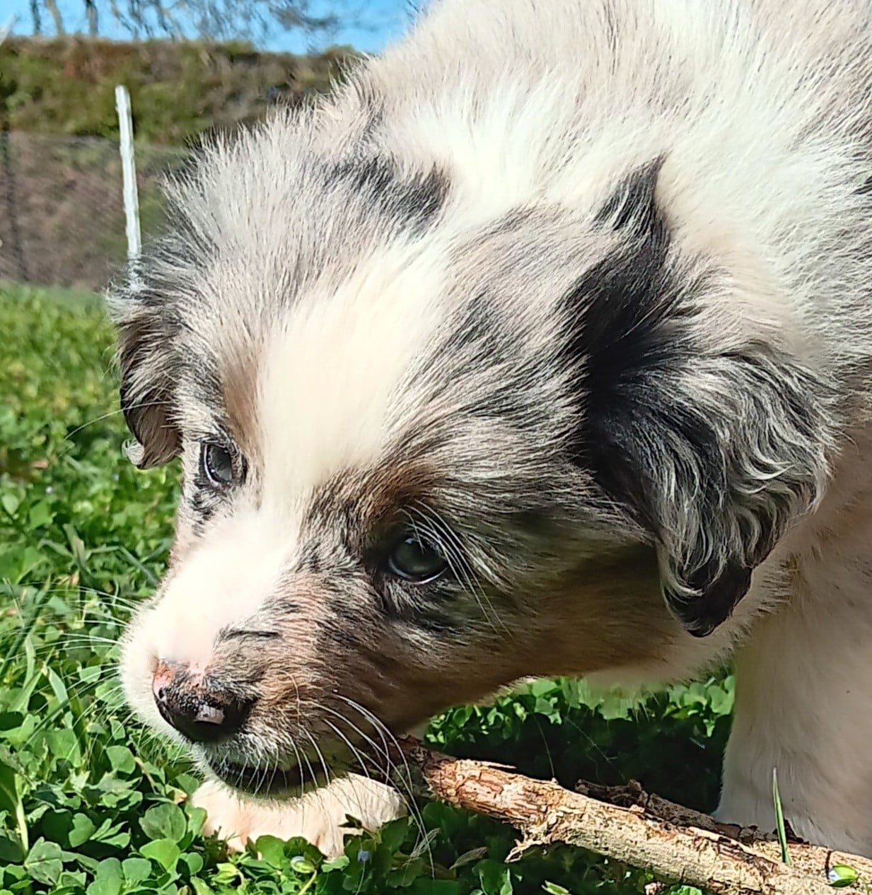 Il a l'âge de rejoindre sa famille. Bien à l'écoute/ éducation et désensibilisation marche en laisse. Une perle Chiot BLEU MERLE Tricolore arrivé en 4ème position. Un beau gabarit au coeur tendre. Sport /famille/ il peut tout faire tant il est posé en plus d'être magnifique. C'est le seul qui s'est fait attendre. Une force tranquille. Full clear par parenté. Queue longue. Beau collier blanc. Portée tant attendue réunissant le meilleur des lignées "sang bleu" 100% Franco-Américaines. Une ascendance rare regroupant les plus grands affixes US .