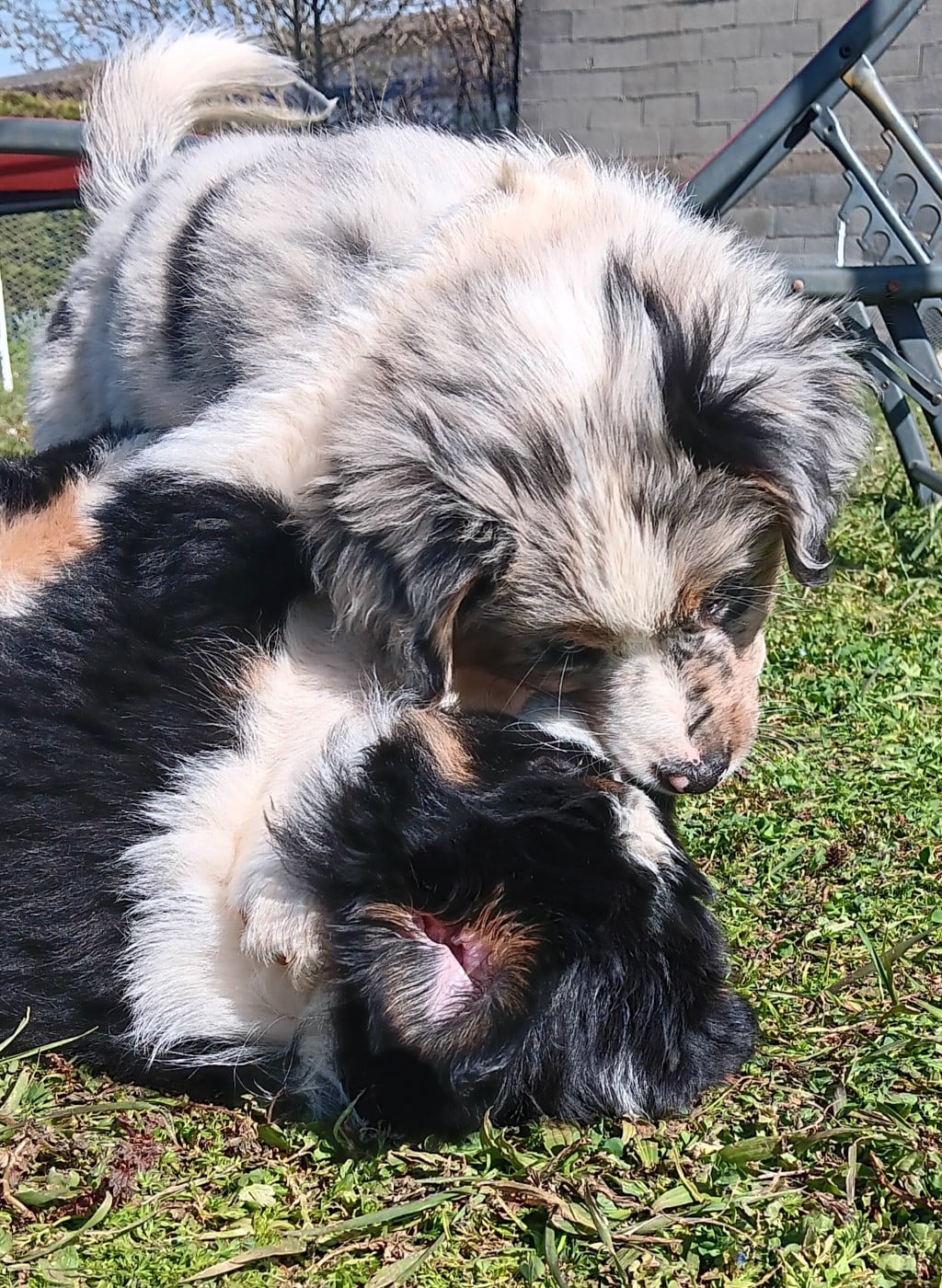 EN COURS DE RÉSERVATION Femelle bleue Merle Tricolore 2 ème naissance de la portée. Gabarit moyen. Full clear par parenté. Queue longue. Portée tant attendue réunissant le meilleur des lignées "sang bleu" 100% Franco-Américaines. Une ascendance rare regroupant les plus grands affixes US : Moonbaby s, Pockets, Away To Me, 74 Ranch et Alta.