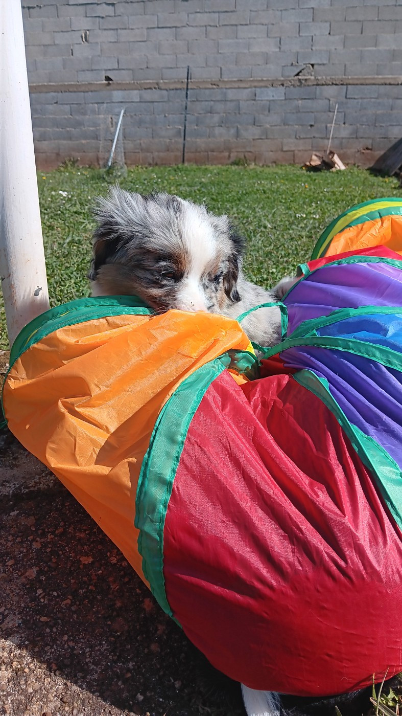 La petite dernière. Bleue merle (Silver) Tricolore . Une vraie fifille pleine de délicatesse. Full clear par parenté. Queue longue. Portée tant attendue réunissant le meilleur des lignées "sang bleu" 100% Franco-Américaines. Une ascendance rare regroupant les plus grands affixes US : Moonbaby s, Pockets, Away To Me, 74 Ranch et Alta.